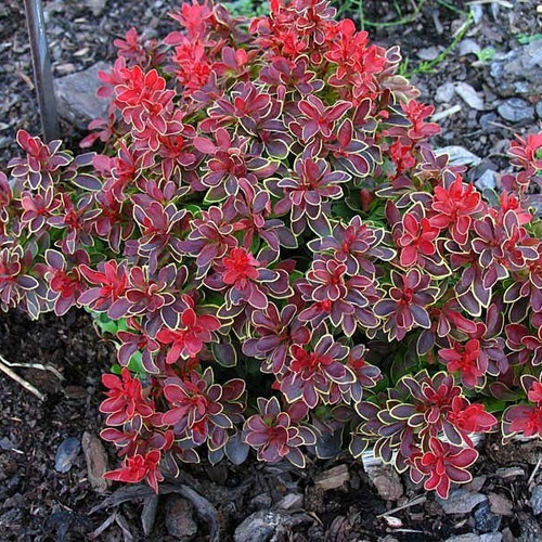 Саженцы кустарника барбариса Атропурпуреа нана (Atropurpurea Nana) – это карликовый подушковидный сорт, высота которого не превышает 60 см, а диаметр может доходить до 1 метра. Листья растения имеют яйцевидную форму и пурпурно-коричневый оттенок, появляются на ветках ранней весной. Осенью листья становятся ярко-красными. Цветки кустарника собраны в соцветия, они округлые желтые внутри и красные с внешней стороны, размер достигает 1см. Часто растение применяется в групповых насаждениях или в смешанных композициях, используется для формирования бордюров и живых изгородей. Отлично переносит стрижку и обрезки. Сорт Атропуупуреа нана высаживается на солнечные места и хорошо переносит несильную тень, но в тени листья сразу начинают зеленеть.