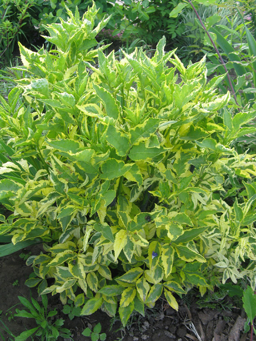 Саженцы Бузины (бузок) черной Мадонна (Madonna) принадлежат к пестролистным сортам: крупная листовая пластина зеленого цвета имеет широкую желто-кремовую окантовку. Многолетник быстро растет образуя многоствольный кустарник, высотой 2,5 метра, с густой раскидистой кроной. Весеннее цветение белыми зонтичными соцветиями добавляют растению декоративности. Осенью куст украшен многочисленными гроздьями черных блестящих несъедобных ягод. Бузина отличается неприхотливостью к почве и уходу, она почти не поражается болезнями и вредителями. Для сохранения пестрой окраски листочков высаживайте растение на свету.