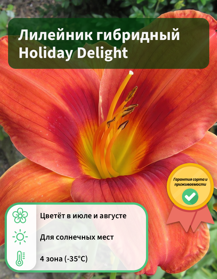 Рассада лилейника "Холидей Делайт" (Holiday Delight) будет великолепно смотреться как в одиночной, так и групповой посадке. Высаживать ее можно на любые участки. Но лучше всего для рассады лилейника "Холидей Делайт" выбирать открытые хорошо освещенные места. В уходе растение неприхотливо. Цветение обильное и продолжается с июля до августа. Цветок яркий, бархатистый, оранжево-красный с темно-бордовым глазком и желтым горлом. В диаметре достигает 17 см. Высота многолетника может достигать 70 см.