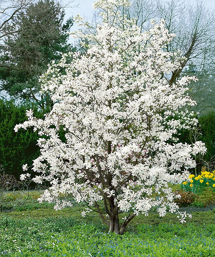 Саженцы магнолии Лебнера Меррилл (Merrill) вырастают в роскошные кустарники с обильным цветением. За год крупномер вырастает на 15-20 см, максимальная высота 7 м. Цветение начинается с апреля, до появления листьев. Цветки звездчатые, распускаются полностью и окутывают весь куст. Магнолия Лебнера Меррилл выносит полутень, но лучше растет и цветет в светлых безветренных местах. Лепестки белые с редкими лиловыми полосками.Цветки могут повреждаться поздними заморозками. Преимущества: