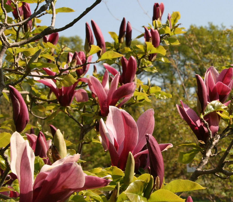Саженцы магнолии Нигра (Nigra) позволяют вырастить прекраснейшие растения для украшения участков в весеннее время. Дерево цветет прекрасными огромными пурпурными цветами в форме вазы в период с конца апреля по середину июня, в два этапа. В наших условиях прирастает не сильно. Корни у крупномера магнолии достаточно хрупкие, расположены как в поверхностном слое, так и уходят вглубь. Прекрасно приживается саженец магнолии Нигра в южных районах при соблюдении некоторых условий. Это почвы, полив, освещение. Любит свет и влагу. Подходит для высадки хороший рыхлый, дренируемый, плодородный субстрат.