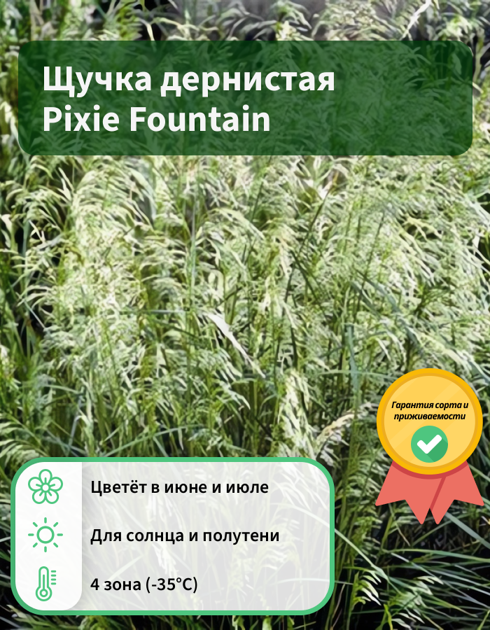 Рассада щучки дернистой Pixie Fountaine (Deschamsia cespitosa) широко используется в садах разных стилей и прекрасно смотрится в массовых посадках. Растение сочетается почти со всеми многолетниками, особенно с розой, амсонией, кровохлебкой, горцем, шалфеем, эхинацеей. Лучше всего щучка дернистая Pixie Fountaine растет в умеренной тени или на солнце. Почва подходит влажная. Кустик в начале лета имеет ярко-зеленую листву высотой от 40 до 60 см. В середине июня декоративная трава начинает зацветать метелками серебристо-зеленого  цвета, которые со временем меняют свой окрас на золотисто-коричневый.